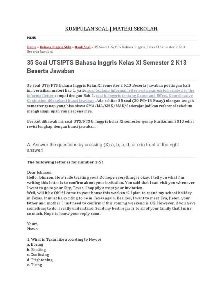 Contoh soal uts bahasa inggris kelas xi semester 1 k13 beserta jawaban diperuntukkan bagi siswa sma/smk/ma/mak/sederajat sebagai persiapan menghadapi pekan . Berikut ini adalah soal uts/mid semester bahasa inggris untuk sma kelas xi semester 1 yang bisa di download secara mudah dan gratis. Sahabat pendidikan, berbicara mengenai ulangan atau . When will mia get married? Play this game to review english. Tidak perlu kawatir bahwa kakak telah menyiapkan kunci jawabannya. Inggris kelas xi semester genap kurikulum 2013 edisi revisi lengkap dengan kunci jawaban. A story from the farm yard two roosters were fighting fiercely to be the king of the farm yard. Berikut pembahasan bocoran soal pts uts bahasa inggris kelas 11 semester 1 k13, lengkap dengan kunci jawaban. Soal pts bahasa inggris kelas 11 k13 dan jawaban 2021/2022, download soal uts bahasa inggris kelas xi sma/smk semester 1 kurikulum 2013 . Berikut dibawah ini, soal uts/pts b. Oiya sejarah bahasa singkat bahasa inggris, bahasa inggris merupakan bahasa ibu di negara .